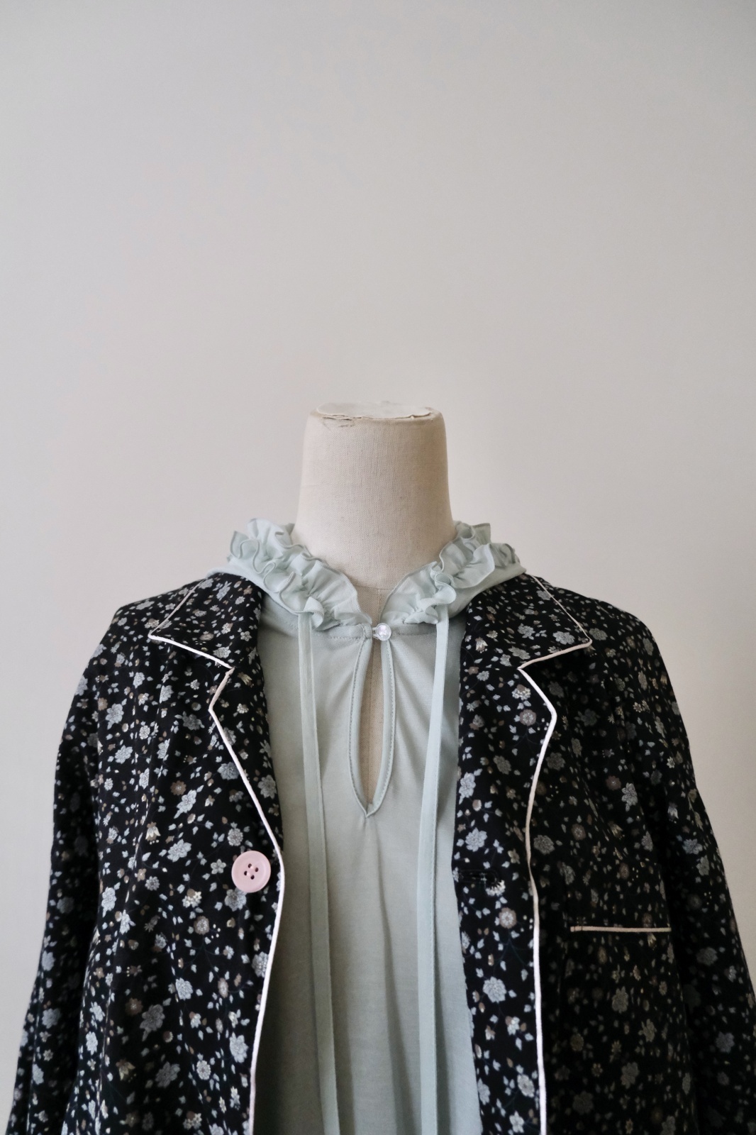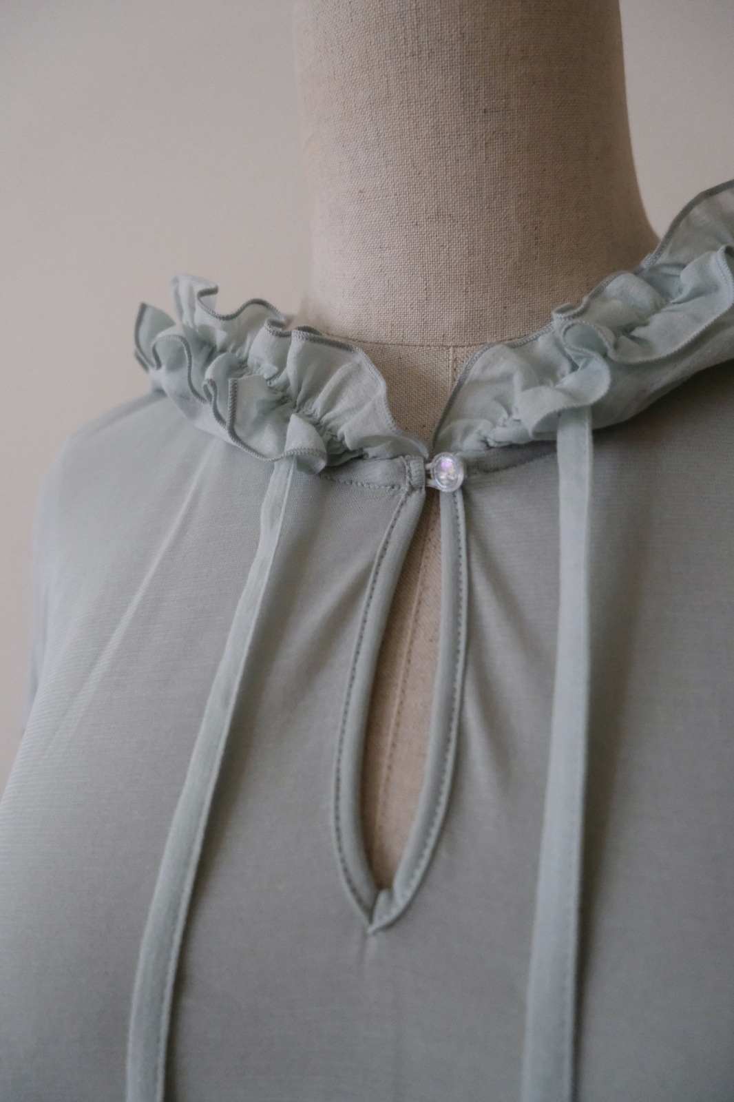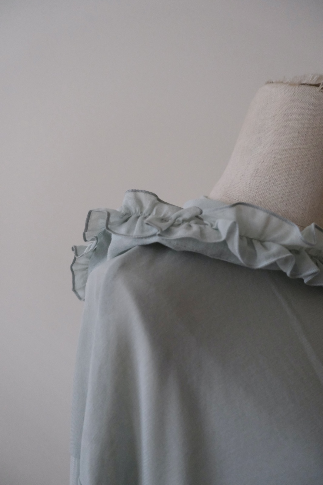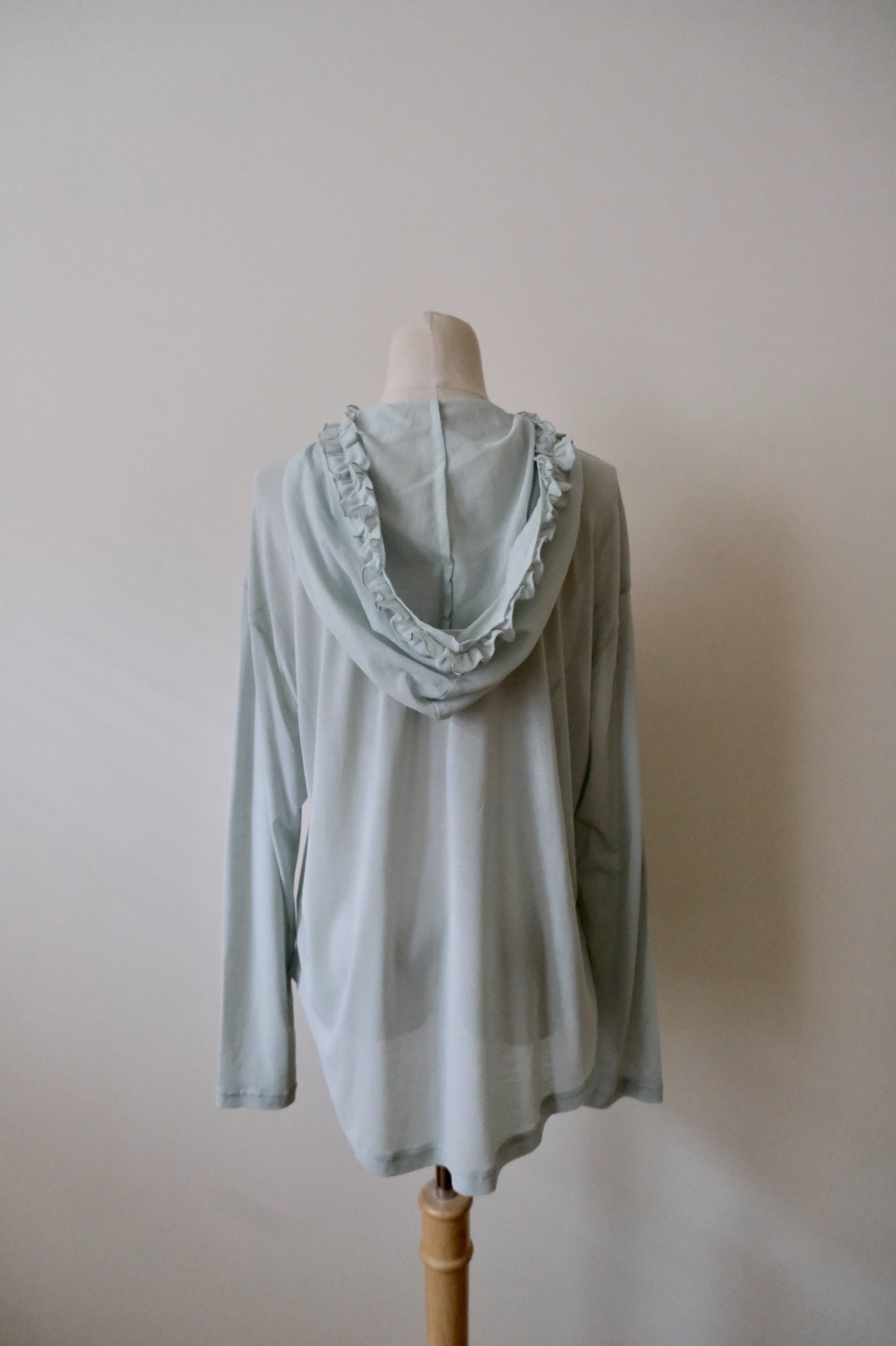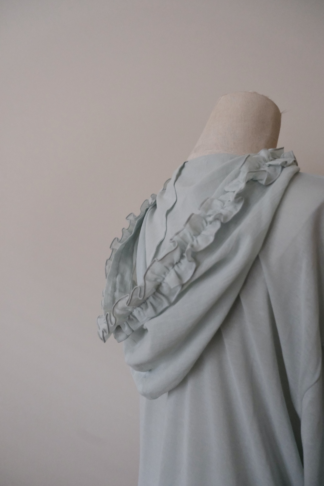 薄く柔らかな天竺のボディに、ふわりと軽いシフォンのフード。 端をフリルで飾りました。