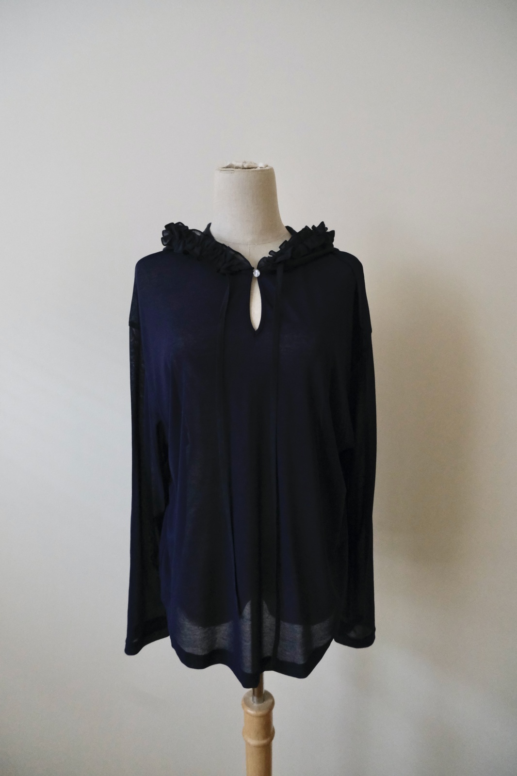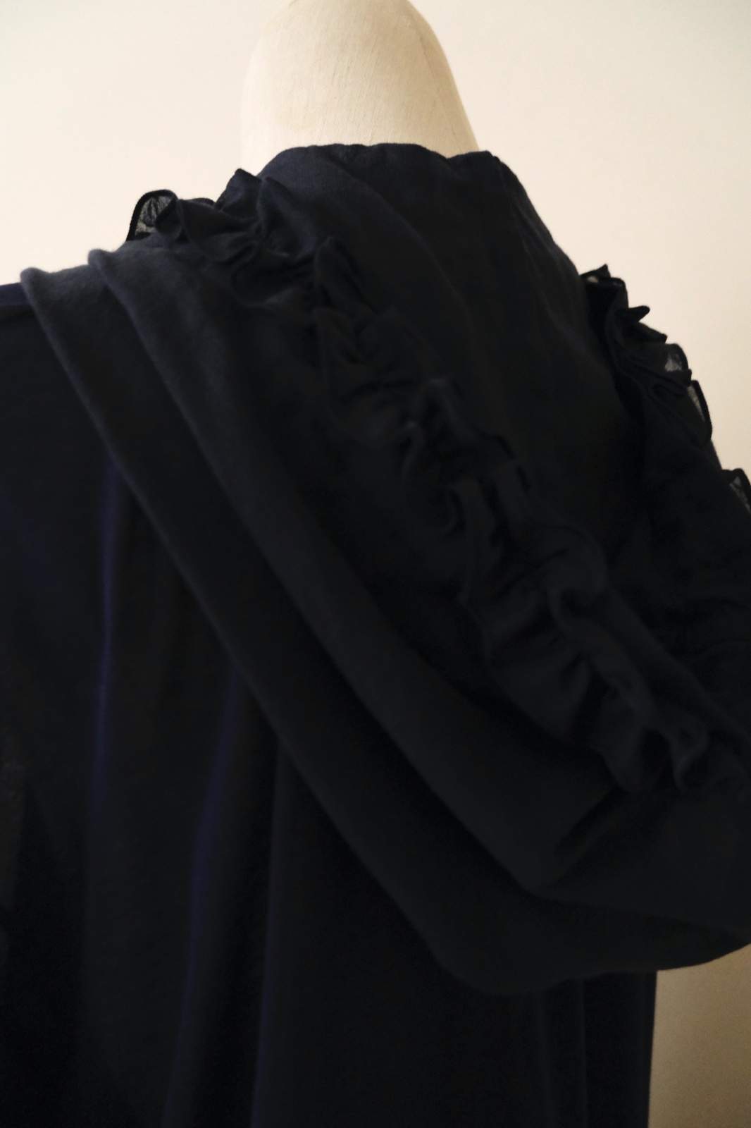 薄く柔らかな天竺のボディに、ふわりと軽いシフォンのフード。 端をフリルで飾りました。