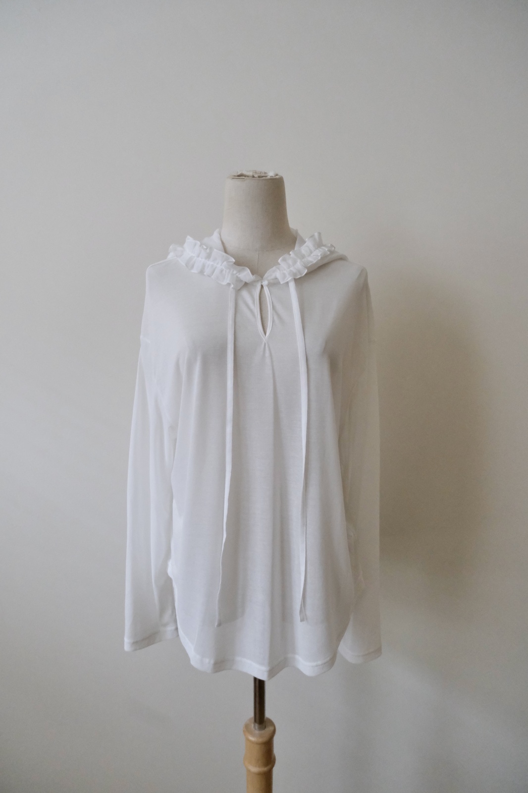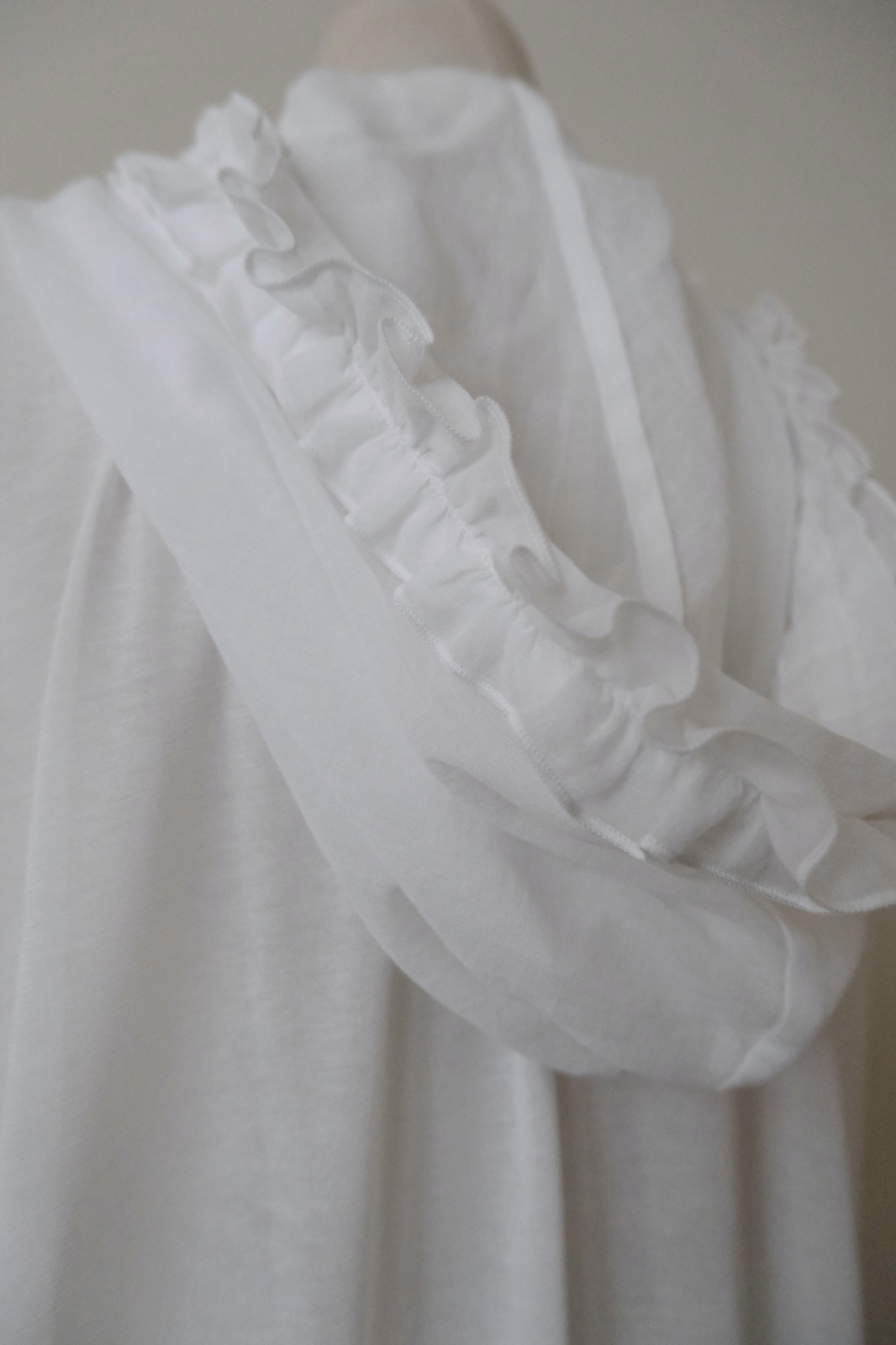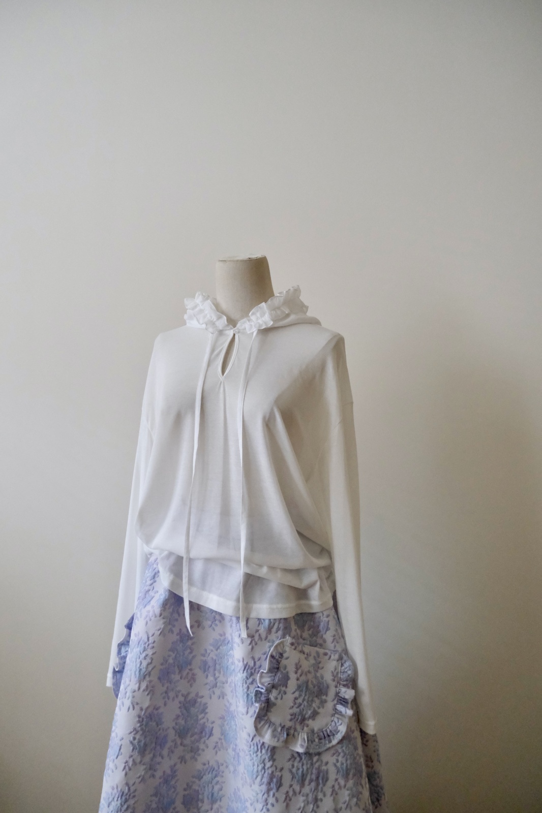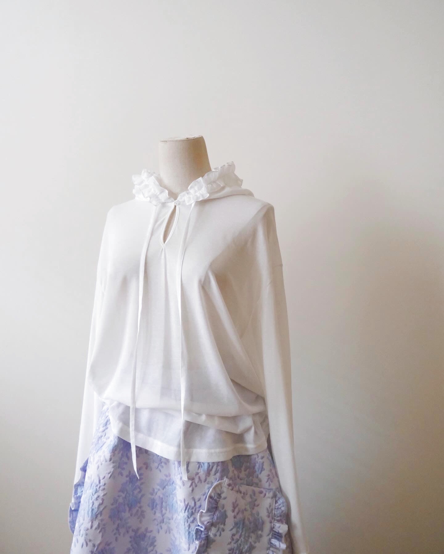 薄く柔らかな天竺のボディに、ふわりと軽いシフォンのフード。 端をフリルで飾りました。