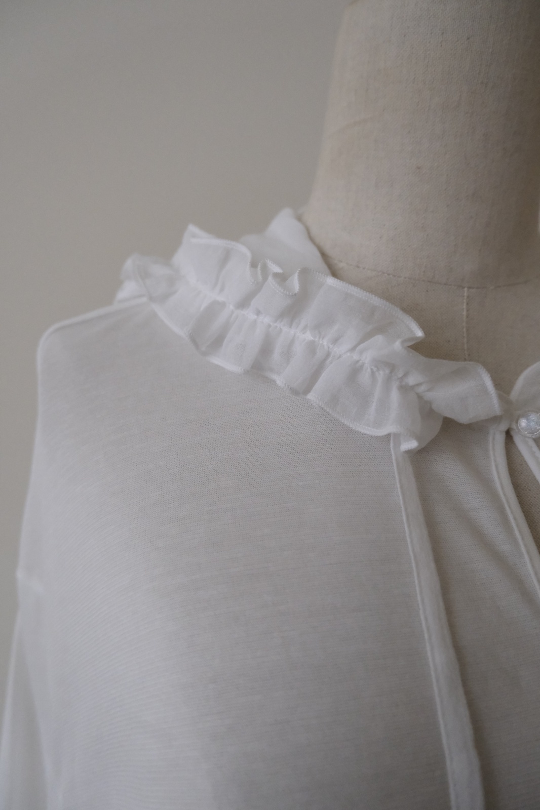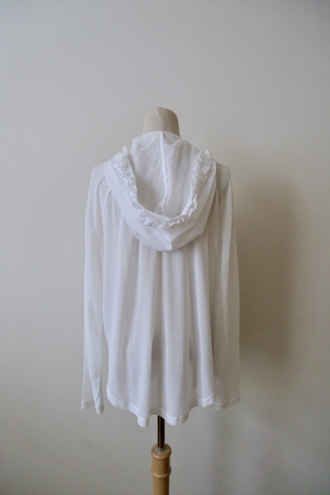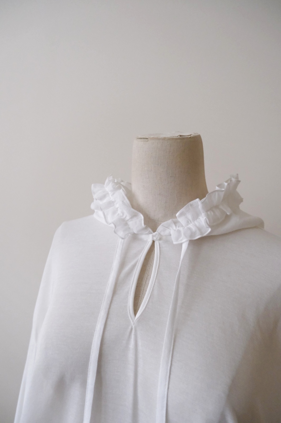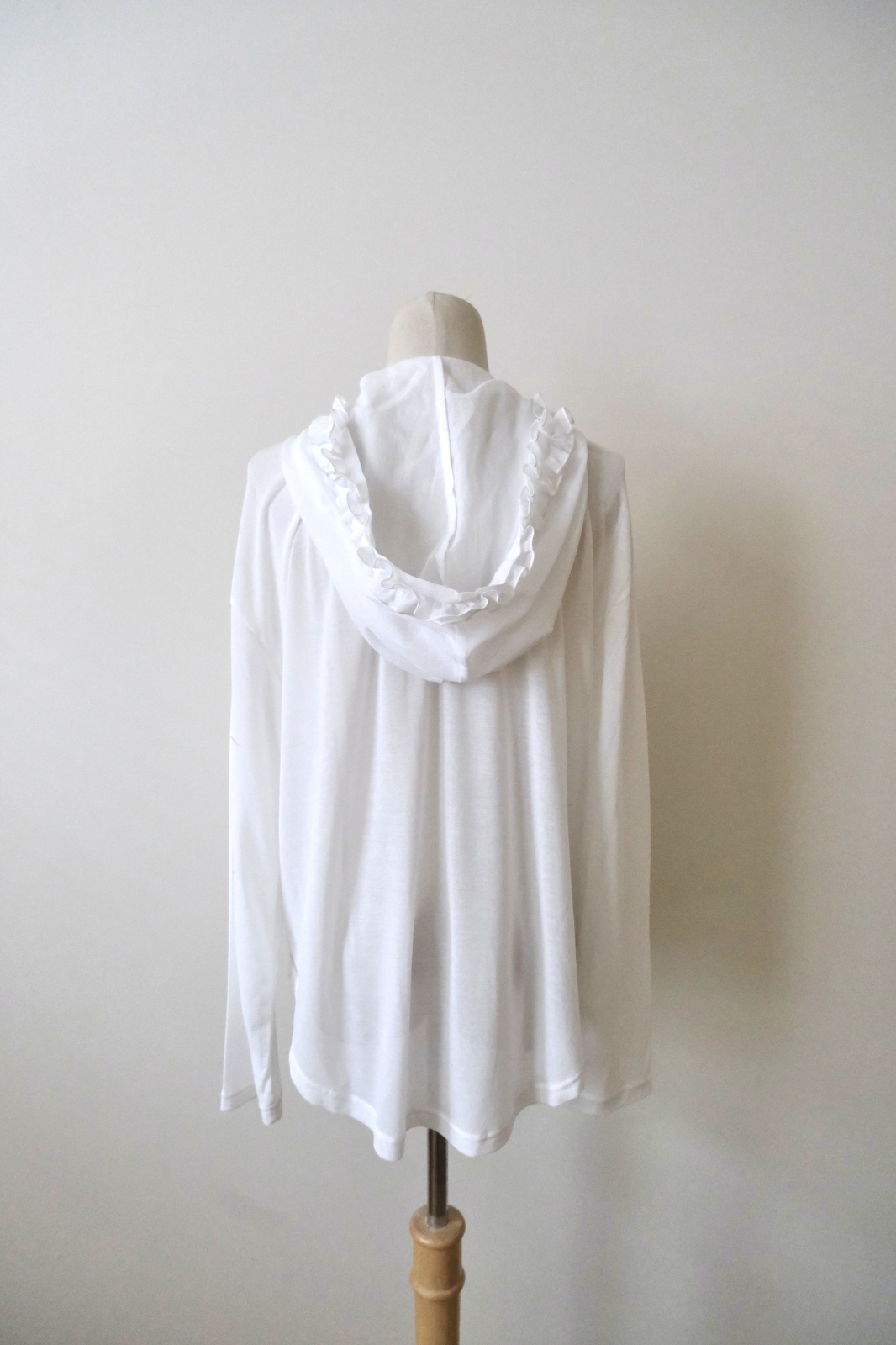 薄く柔らかな天竺のボディに、ふわりと軽いシフォンのフード。 端をフリルで飾りました。
