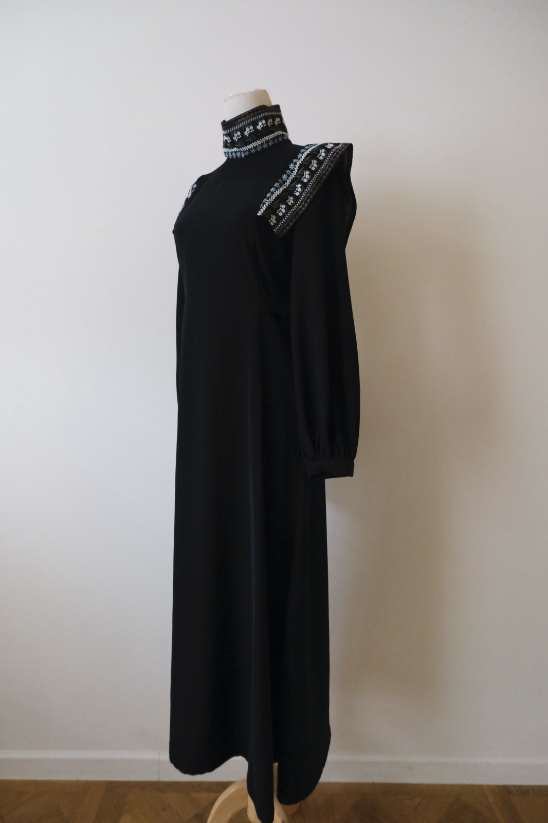その刺繍が首元、肩周りと上半身に効果的に使われていて、パッと目の引くデザイン。