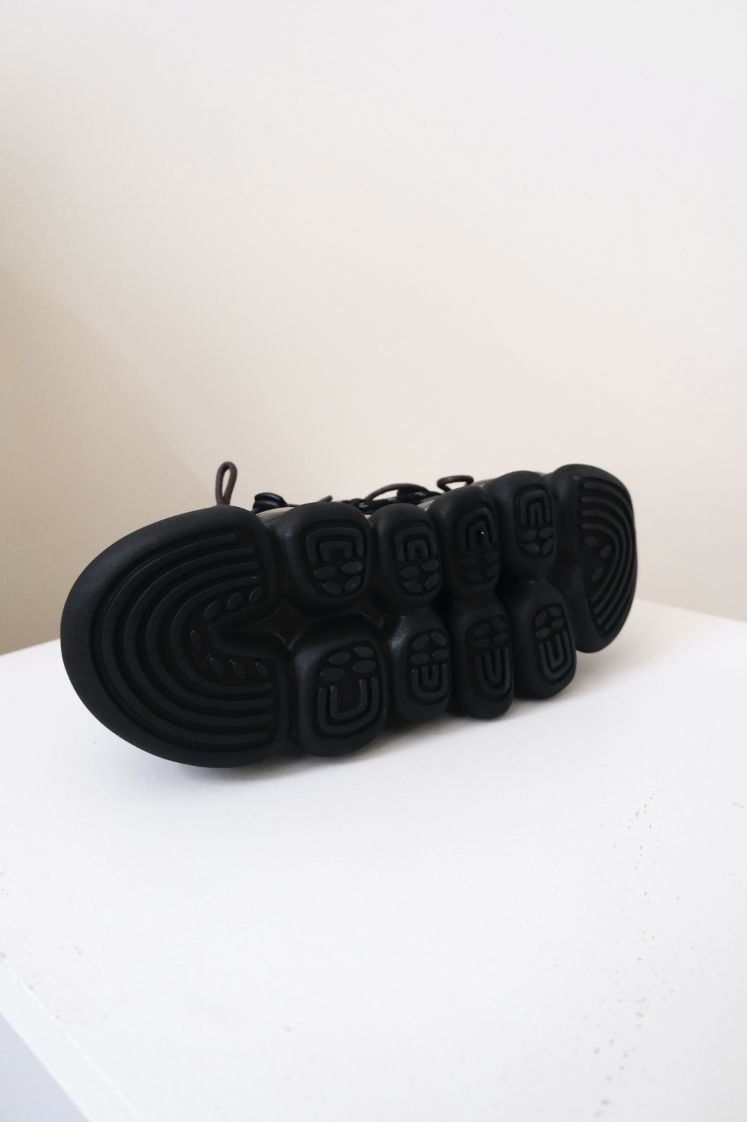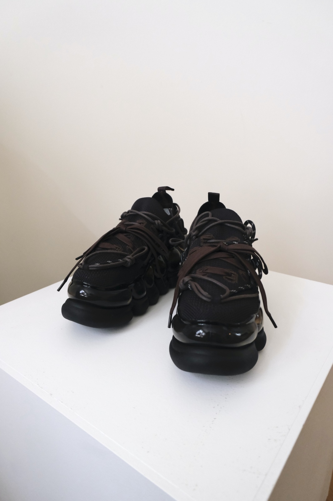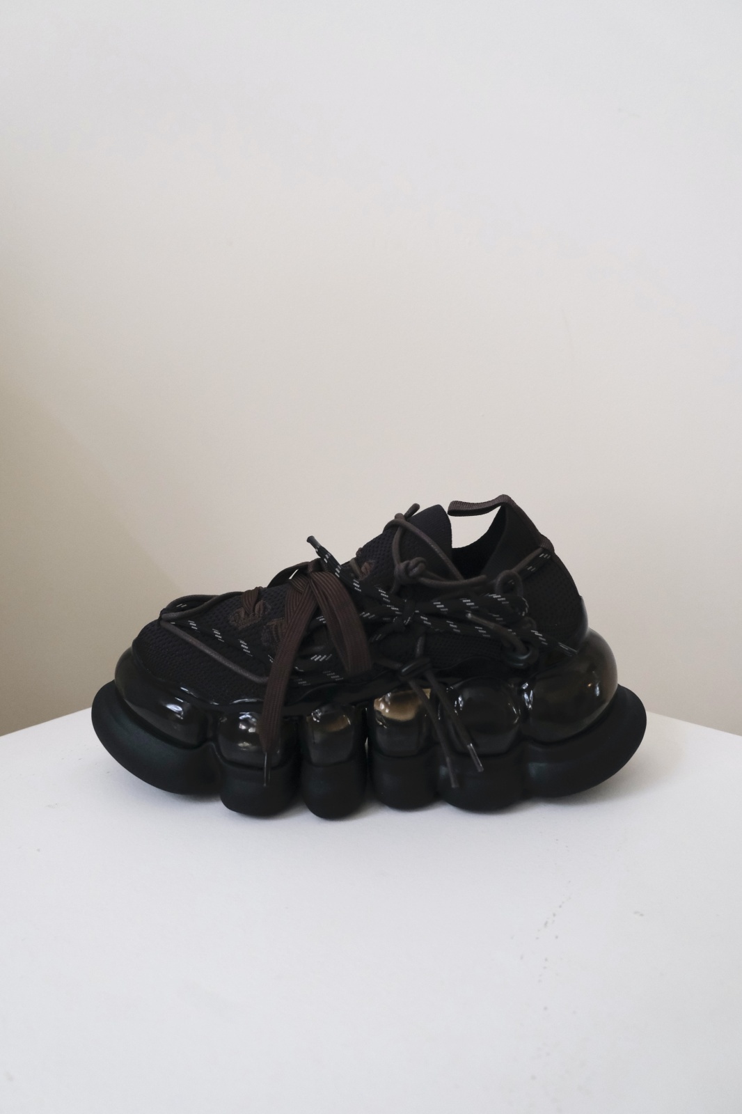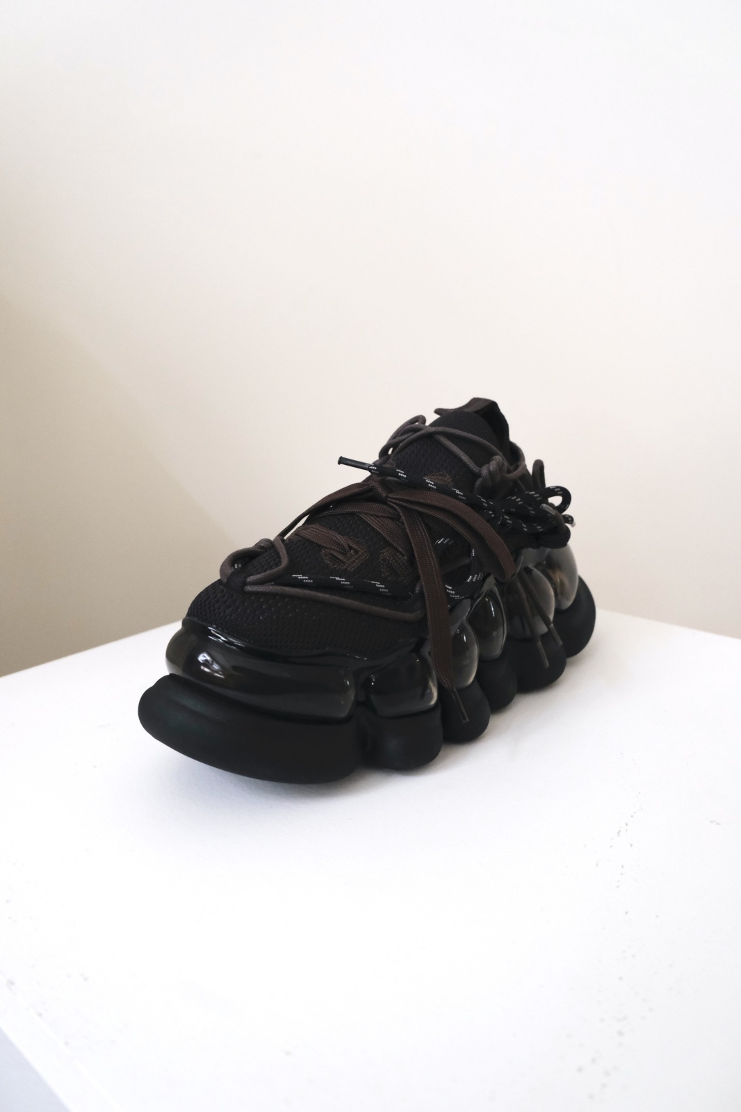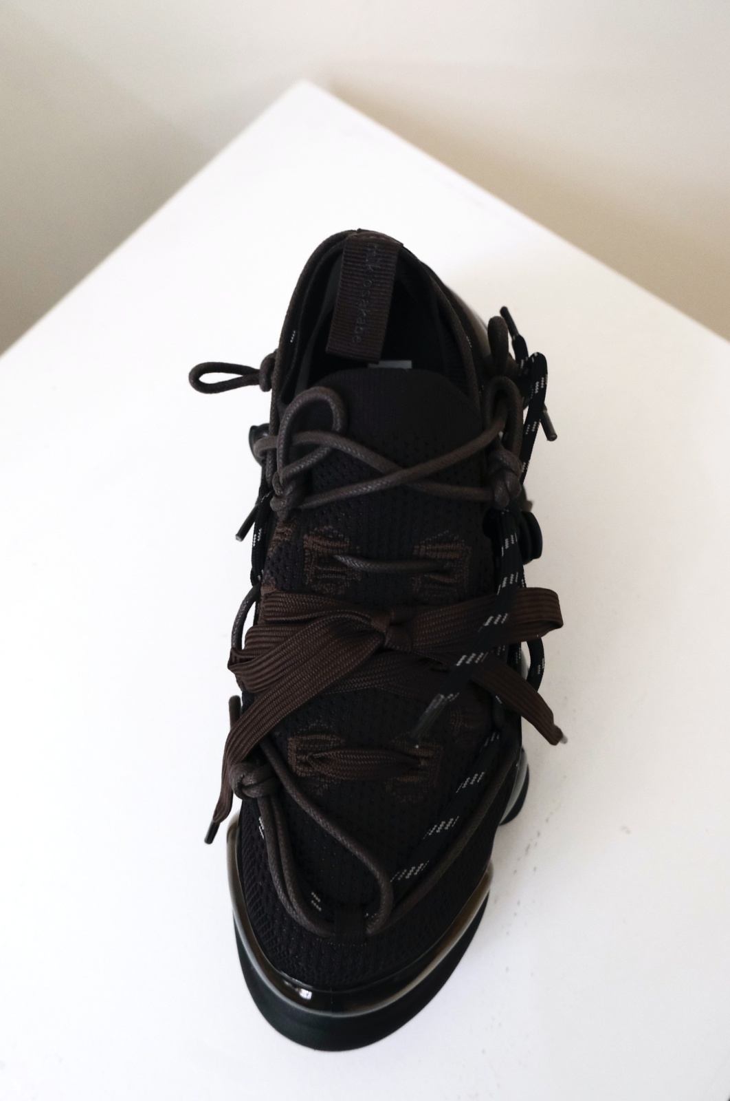 ツートーンのニットアッパーに4種類のシューレースを使用したシューズ。