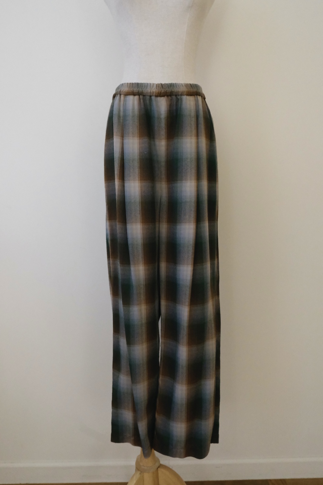 レーヨンの上品な光沢とドレープ感が美しいオンブレチェックイージーパンツ。