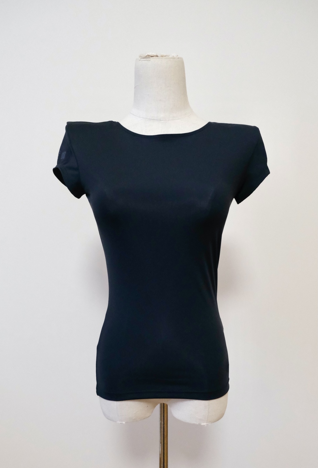 ストレッチ性があり肌感触の良い、マットな質感の生地の肩パッド付きtopsとなります。