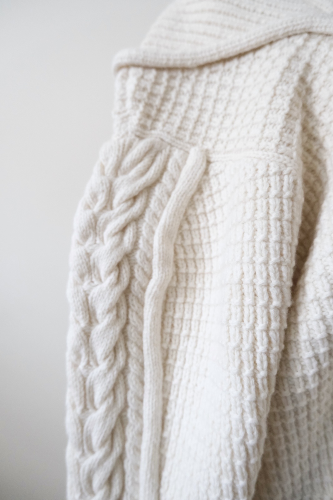 アランニットって、色々あって編み目が可愛いなと思っていたけど、こんなこともできるんだ。