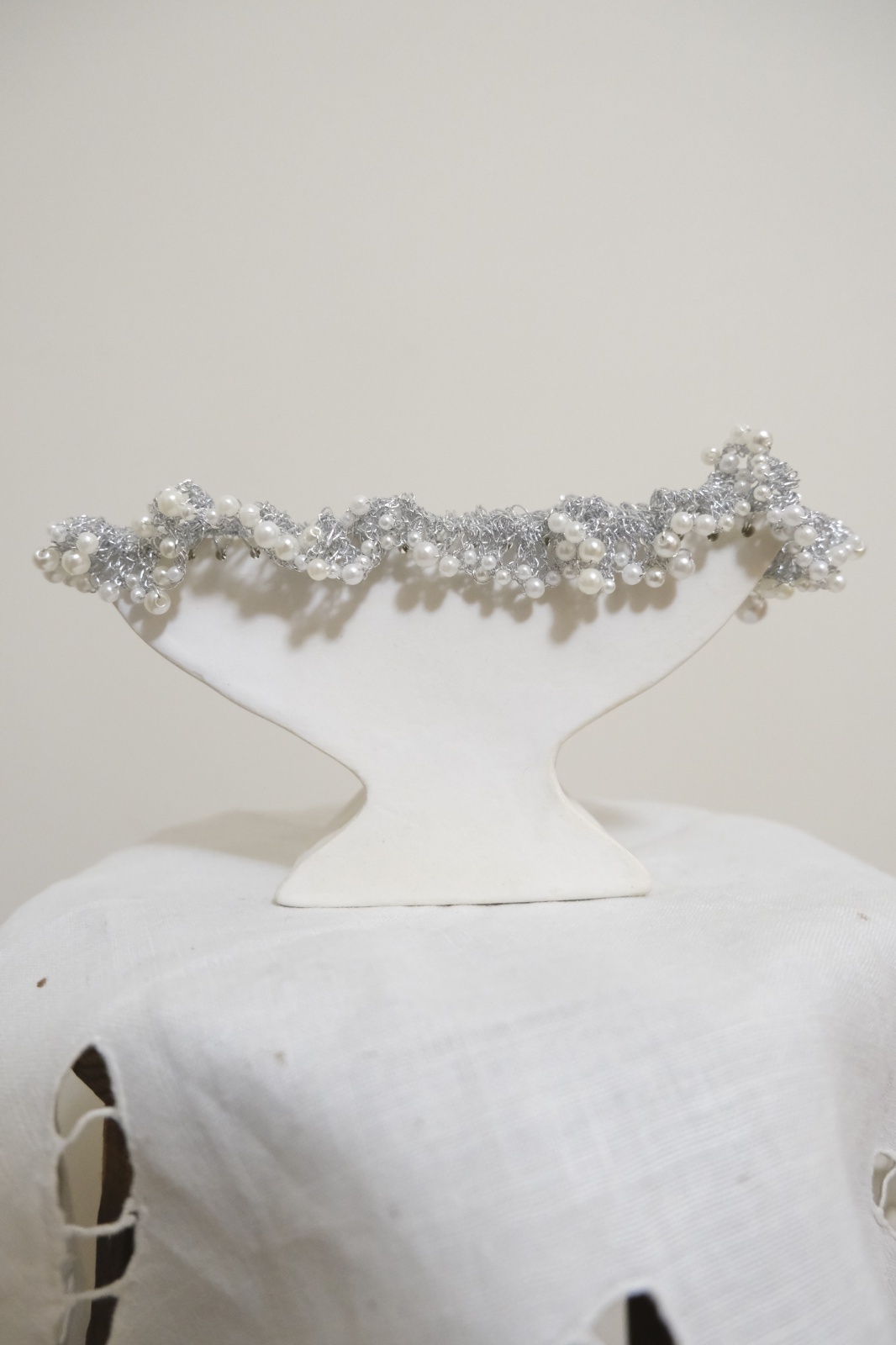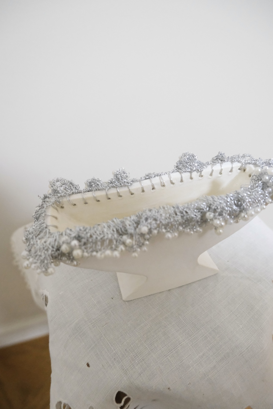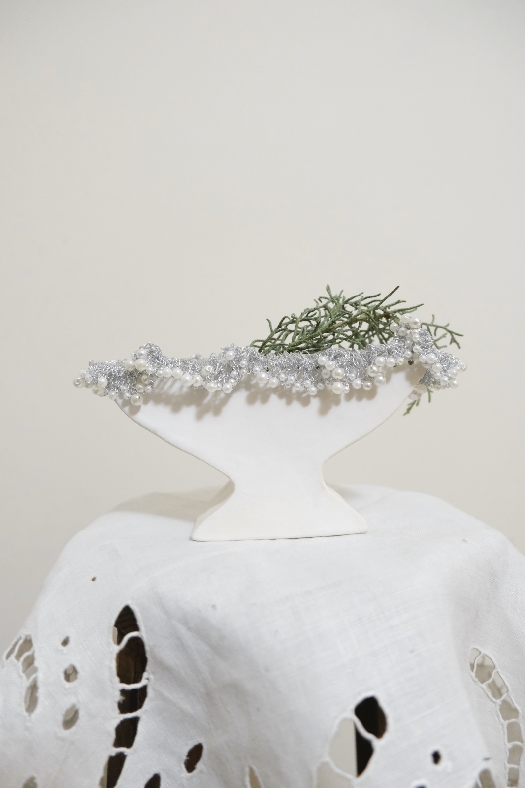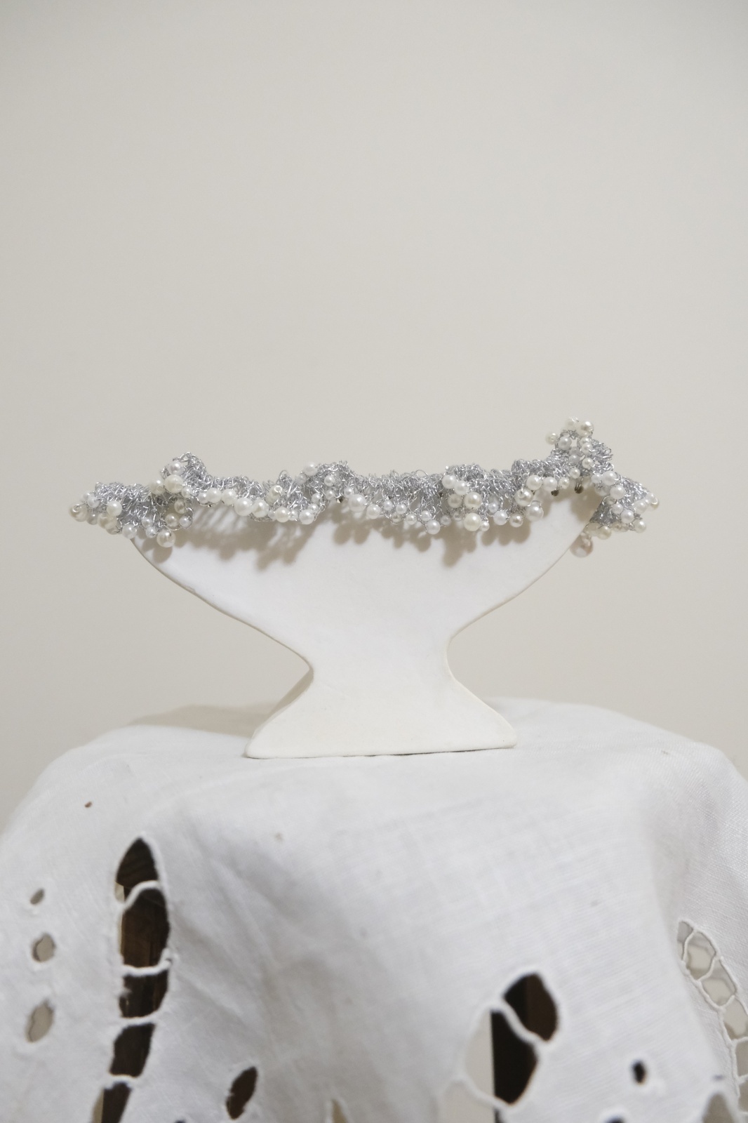 lace trimは陶器にメタリックな糸をレース編みした挑戦的なシリーズです。
