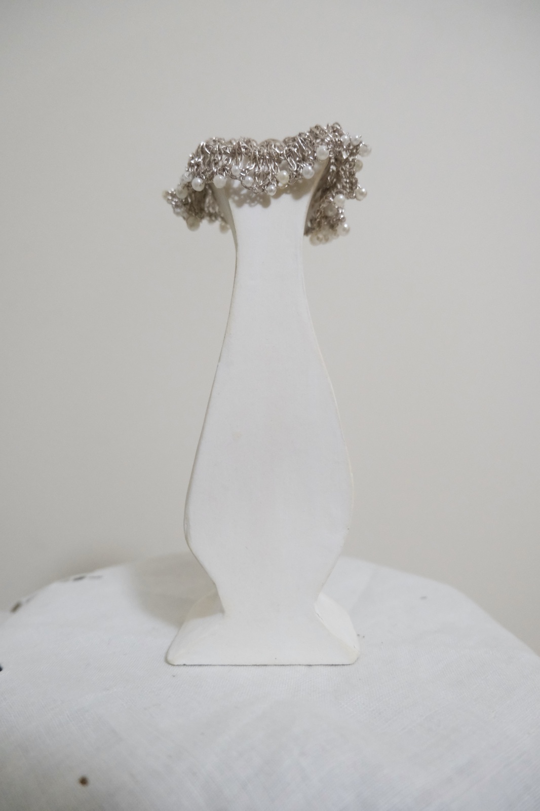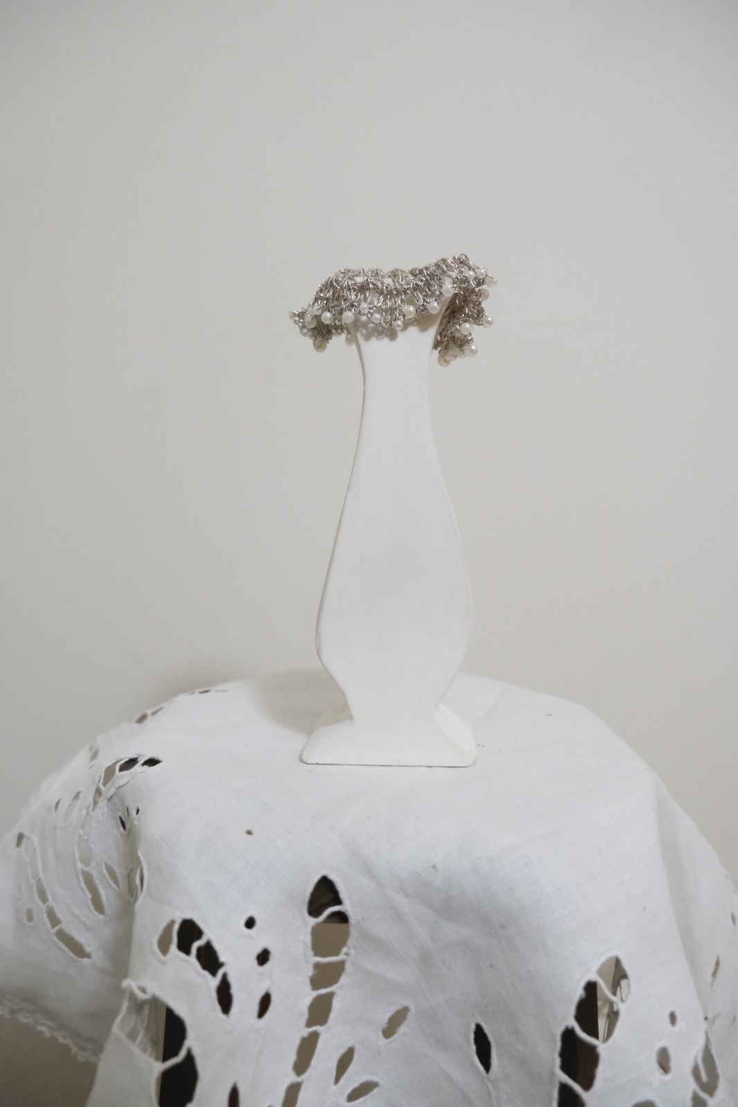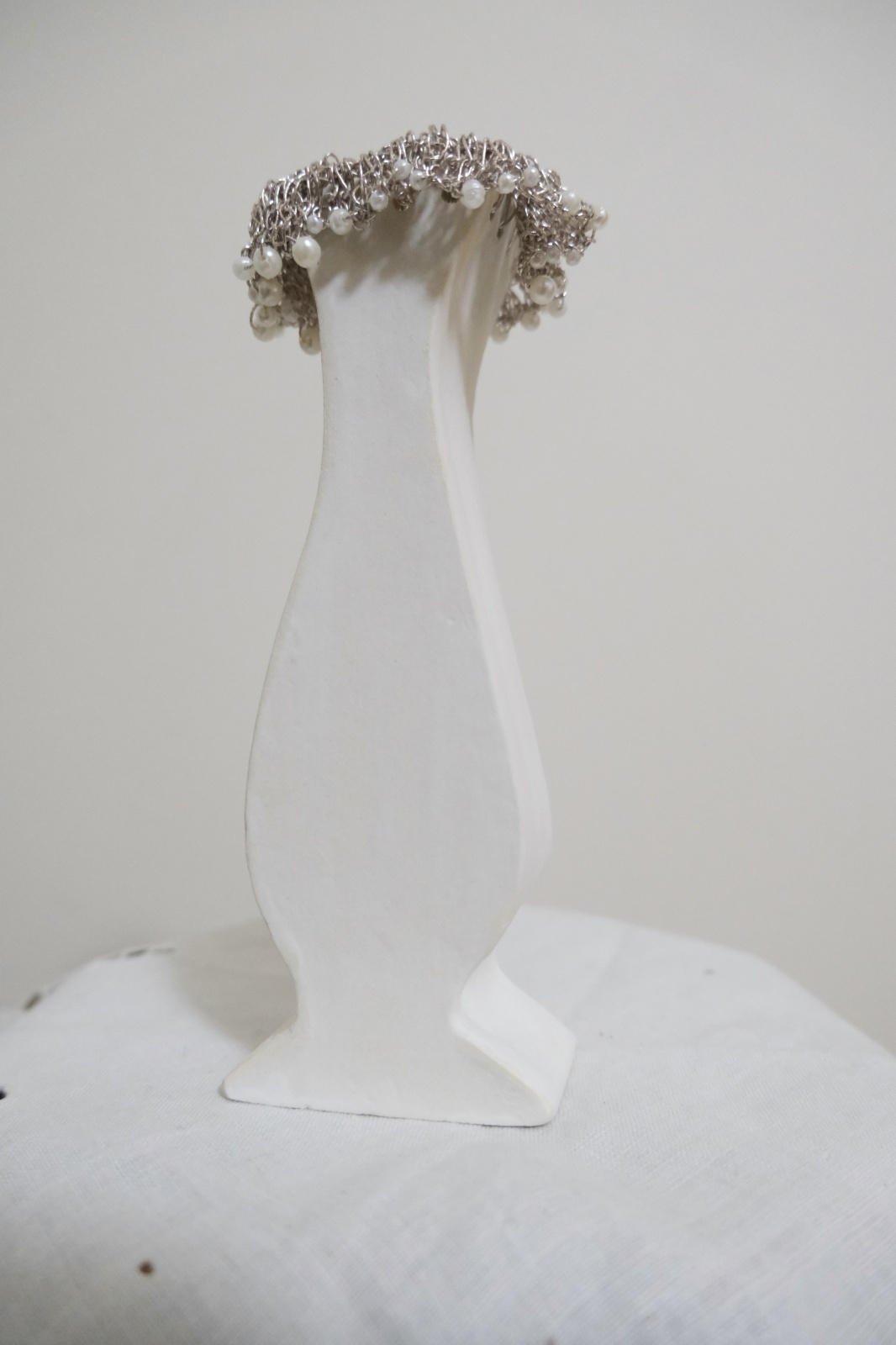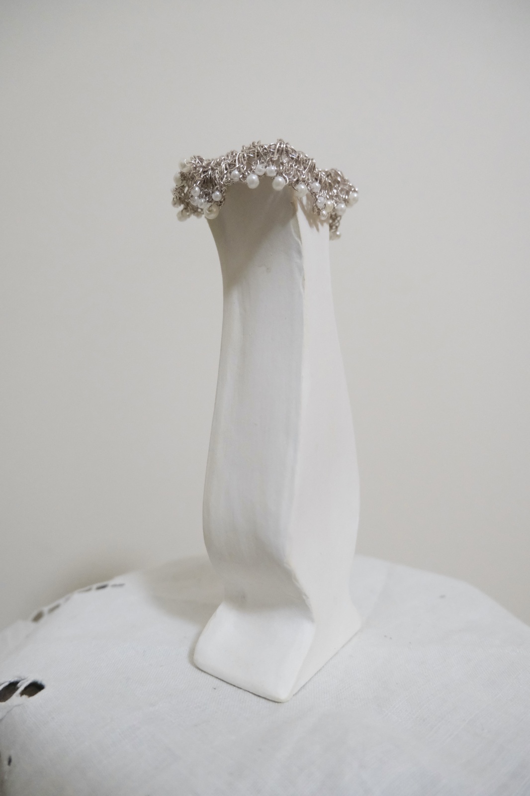 lace trimは陶器にメタリックな糸をレース編みした挑戦的なシリーズです。
