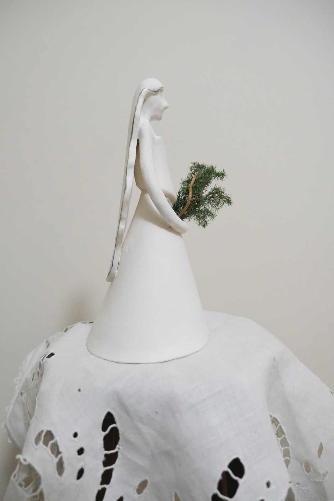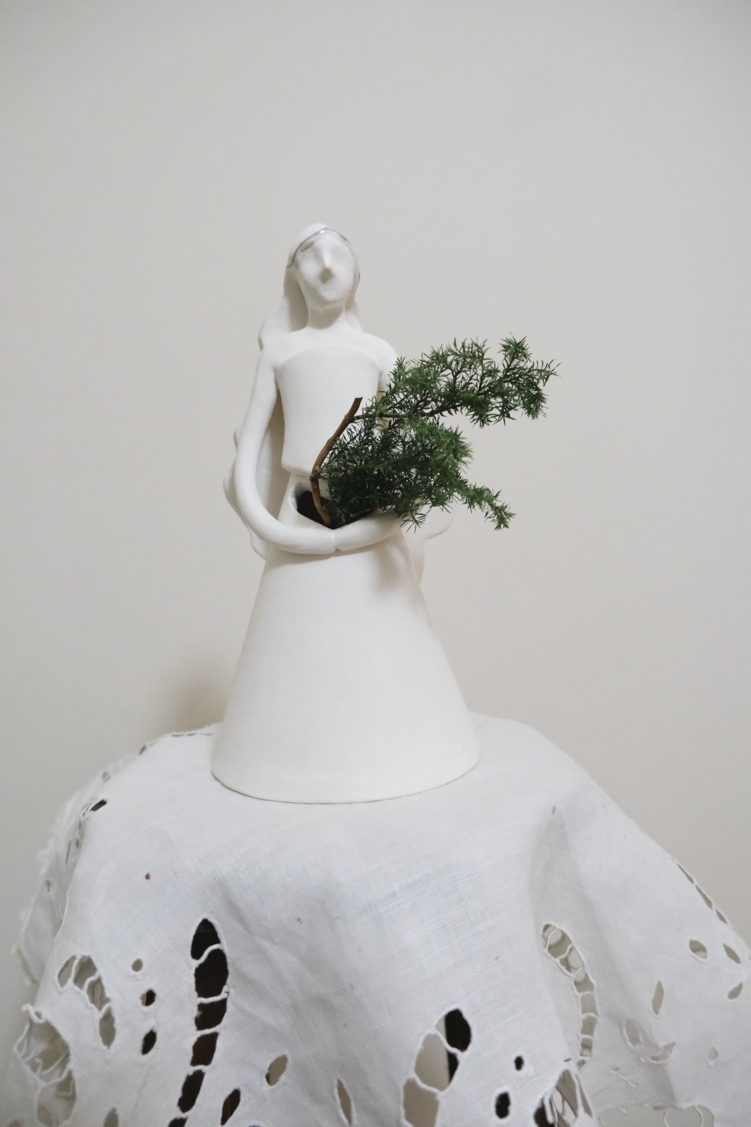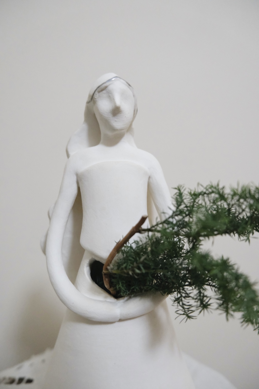 お腹のところから水や植物を入れれるので、飾るとちょうど手にお花を抱えたようになる。