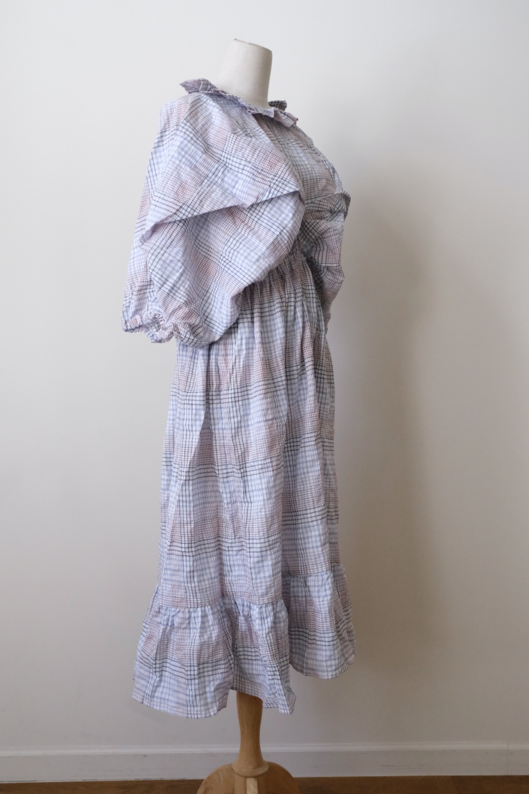 着てみると楽ちんなワンピースですが、ウエストと袖口にゴムが入っていてキュッとシルエットが絞って見えます。