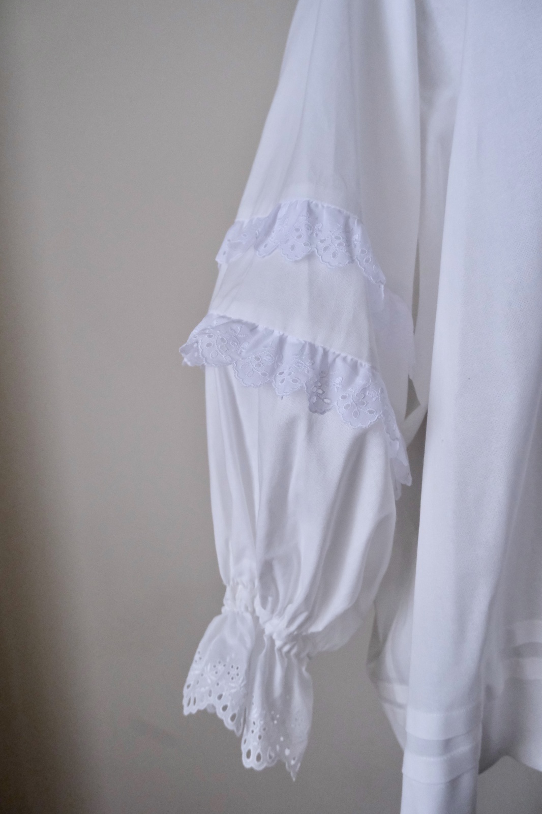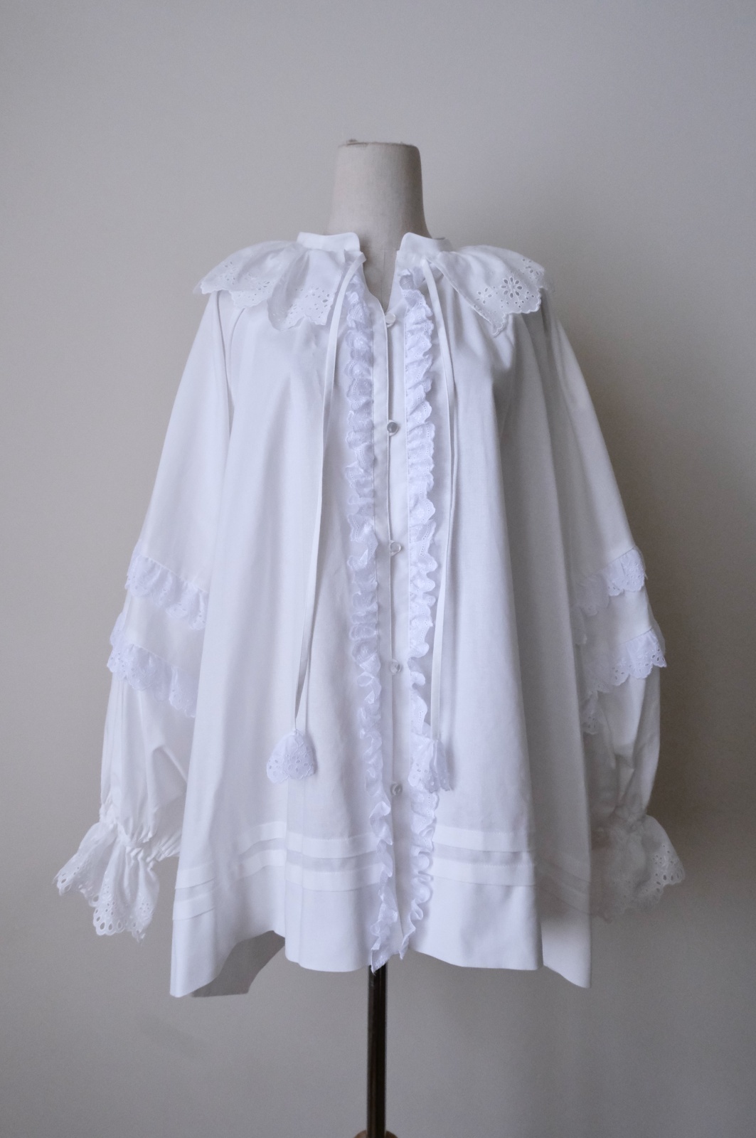 たくさんのレースをあしらったボリュームのあるブラウス。