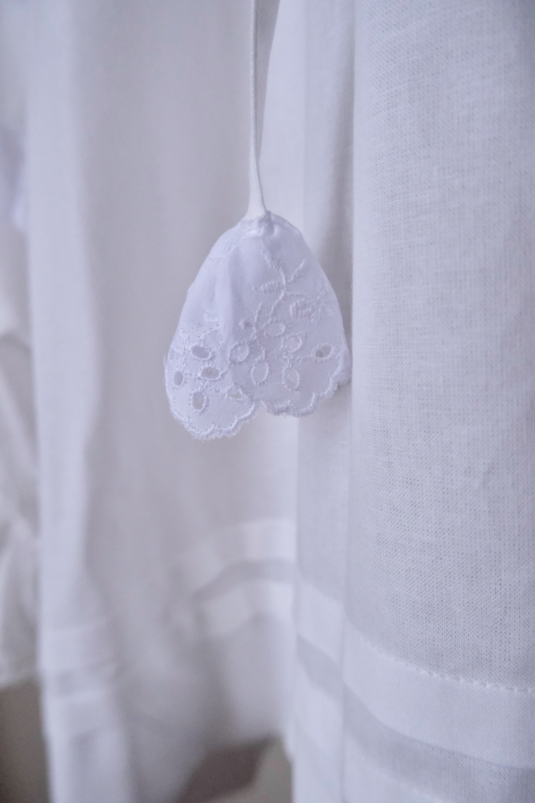 首周りのレースのお花なんてこの上なくかわいくて、シェルのボタンはみずみずしい透明感をあたえてくれます。