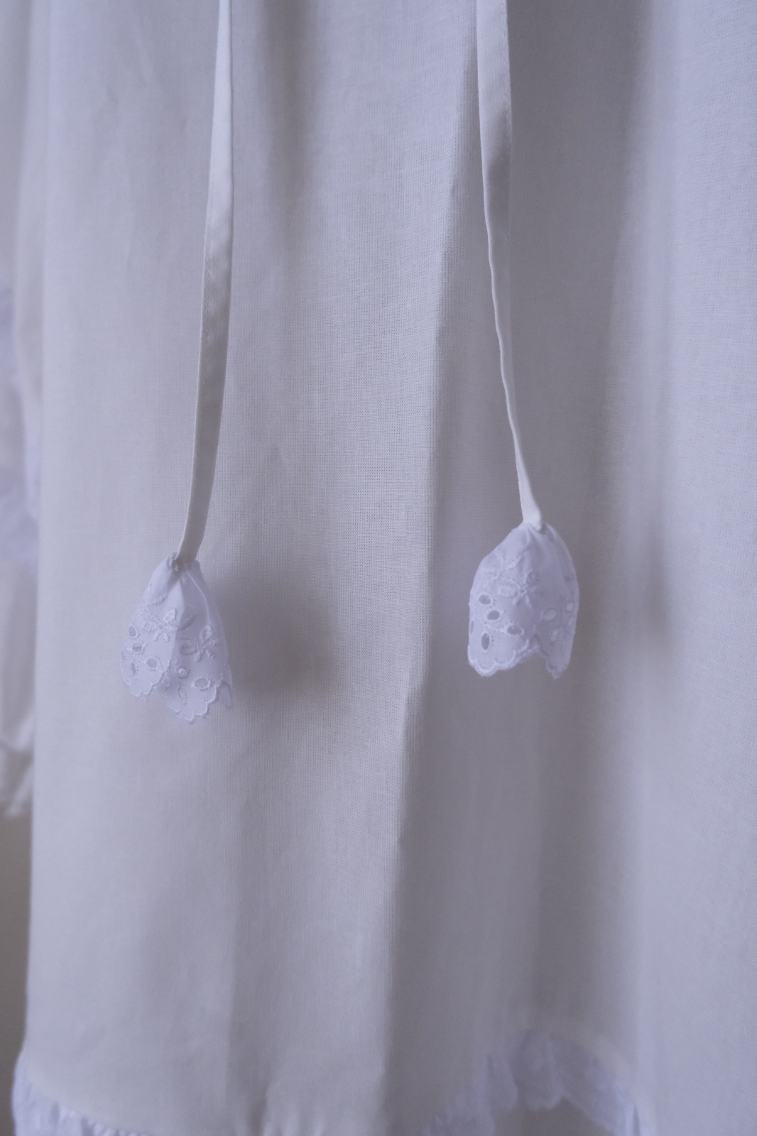 少しゆるく立てたクリームのようにゆったりと落ちる裾。紐先にレースのお花つき。