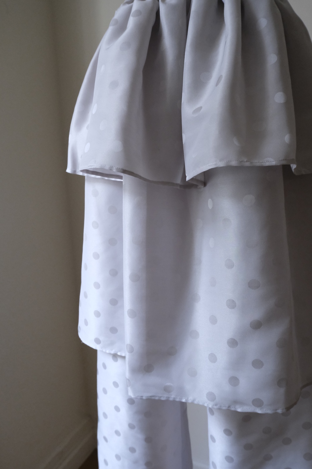 うっすらと透け感のあるやわらかな布の上に光沢感のある同色のドットがほどこされた見た目にも軽やかな生地です。