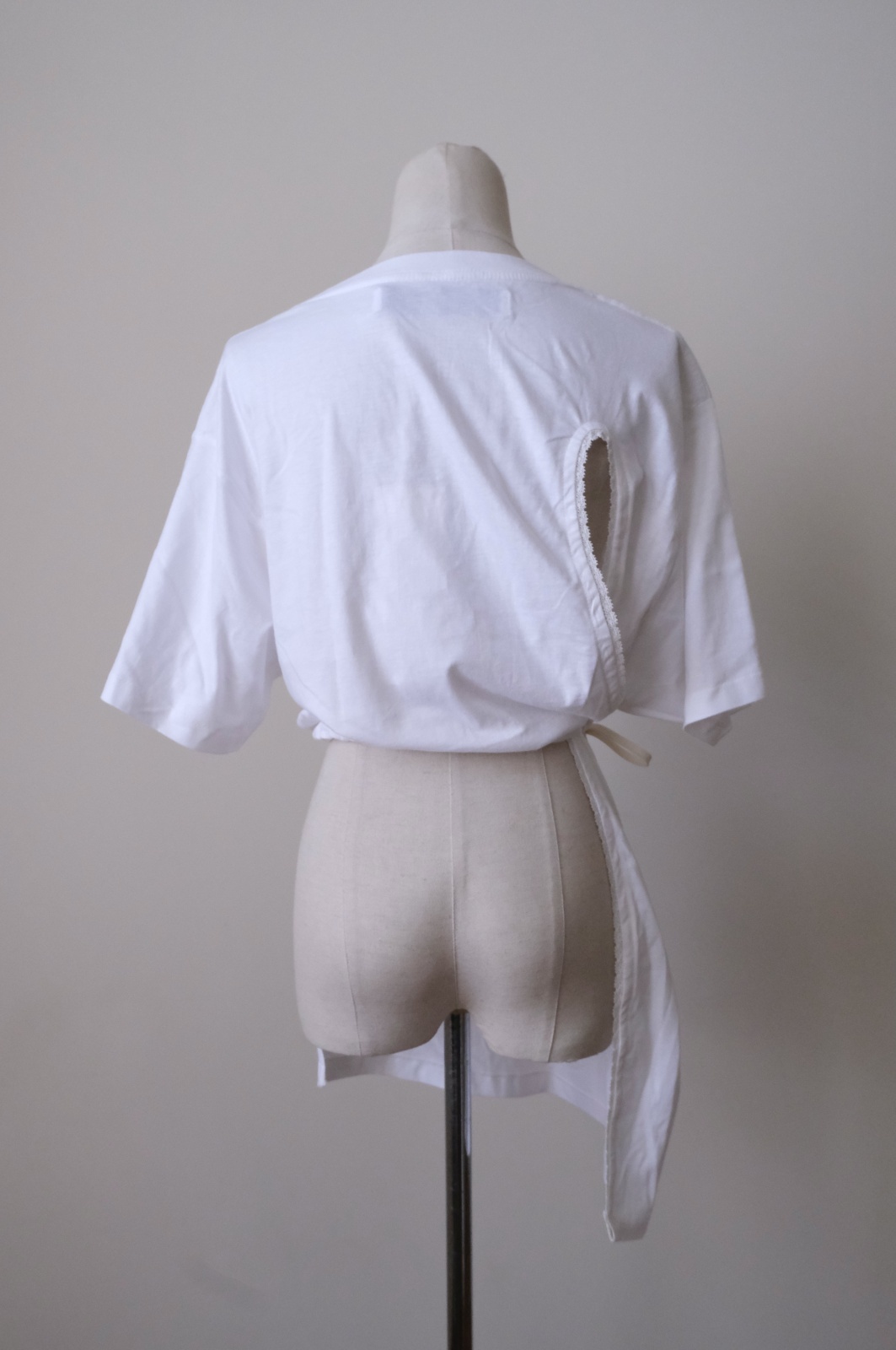 ウエストのリボンでカシュクールのように結ぶと、方とバックスタイルに少しスリットがはいって