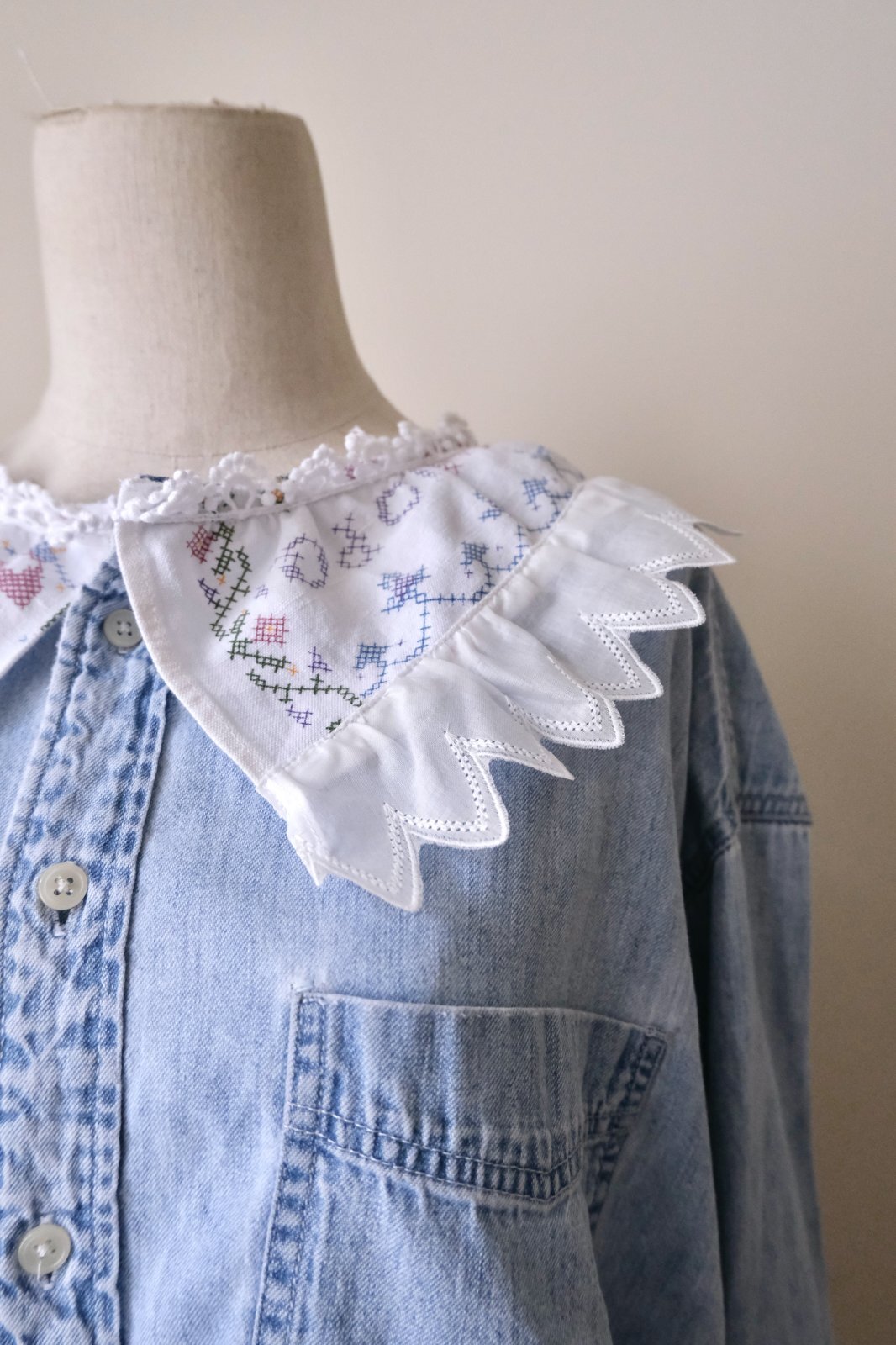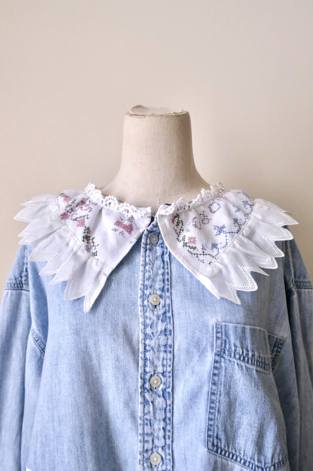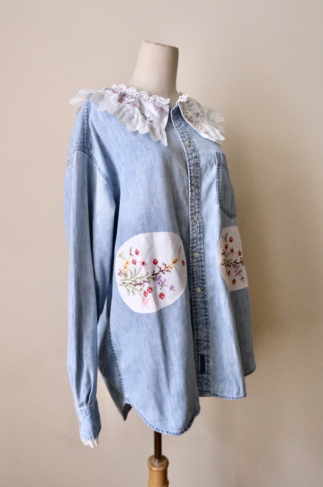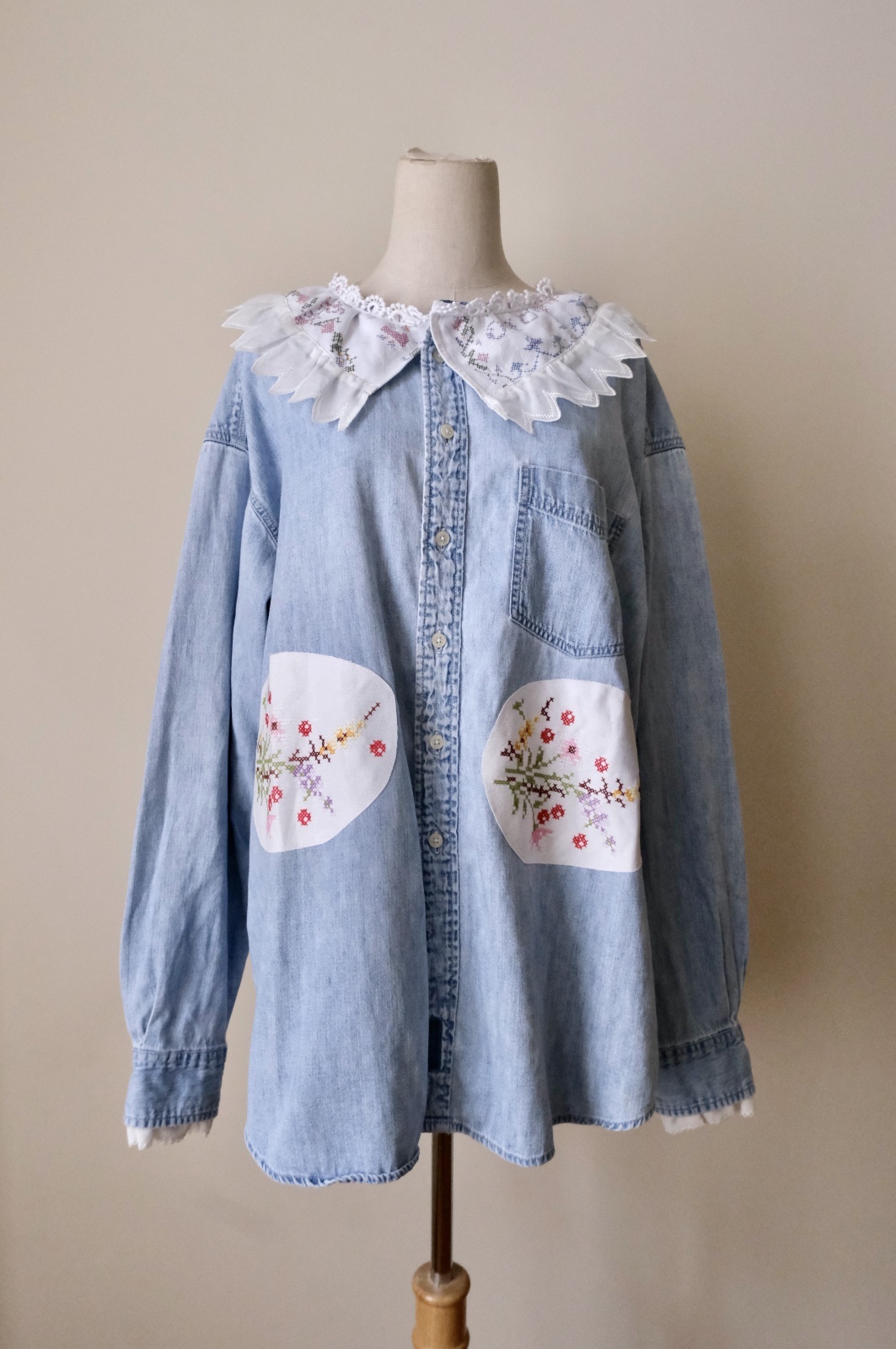 デニムシャツをレース襟や刺繍をパッチワークして可愛くリメイクしています。