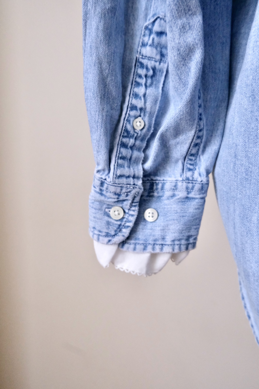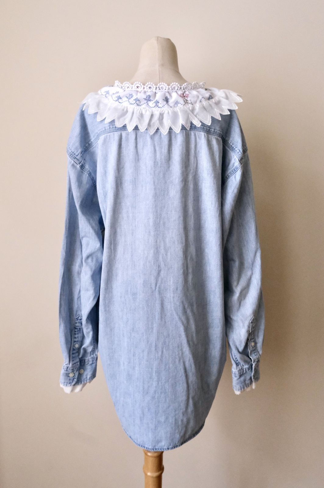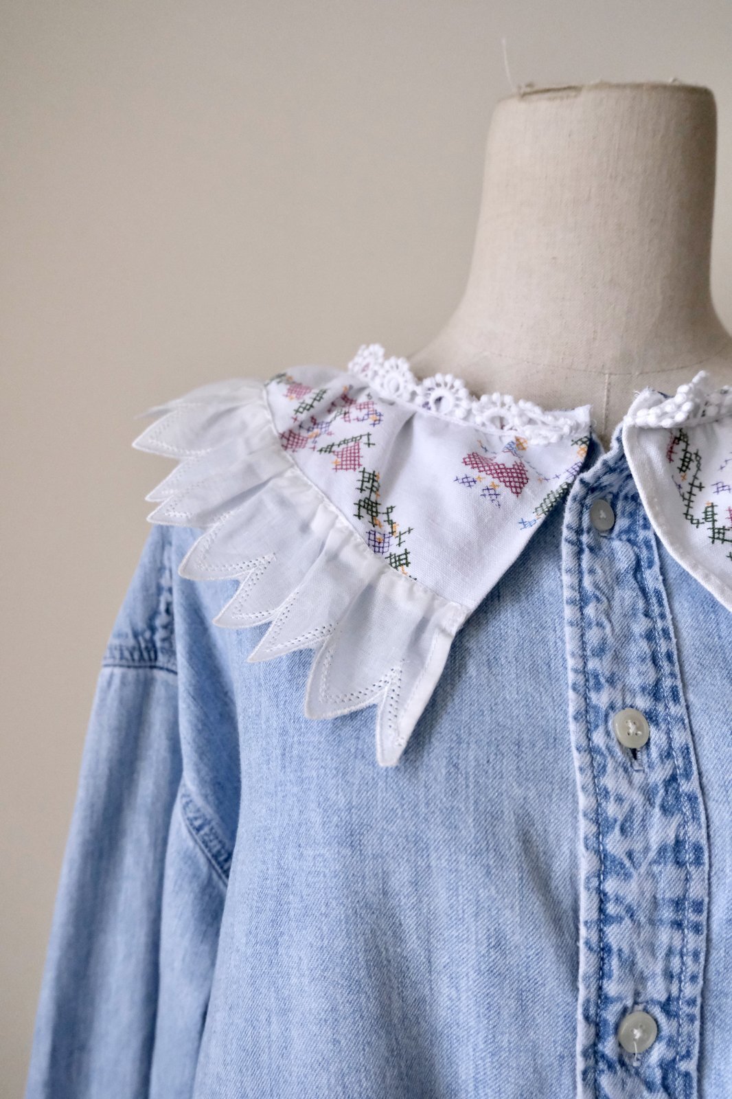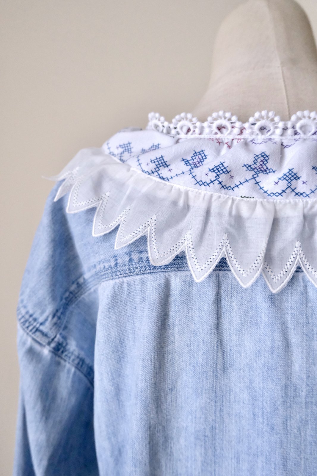 デニムシャツをレース襟や刺繍をパッチワークして可愛くリメイクしています。
