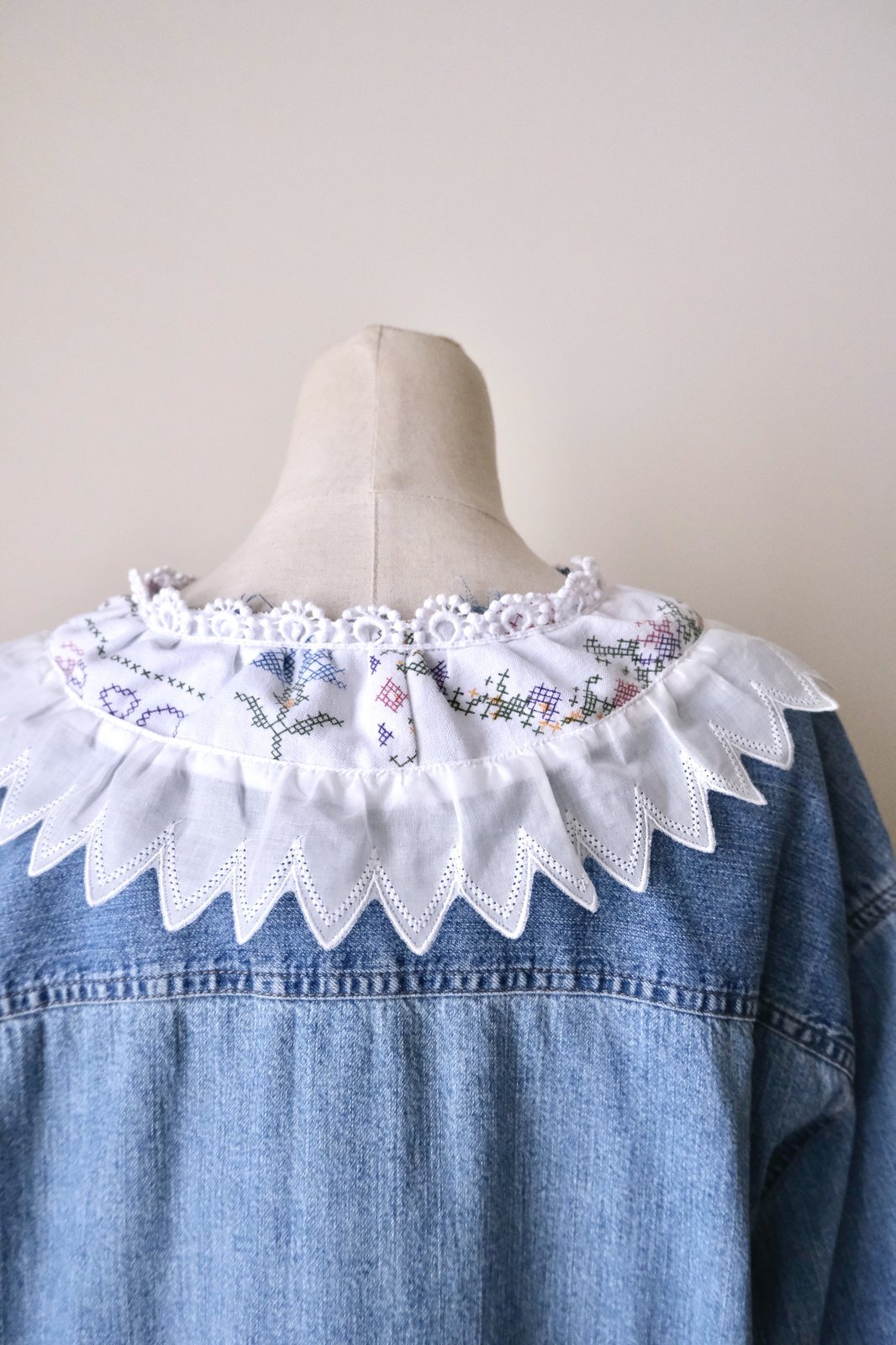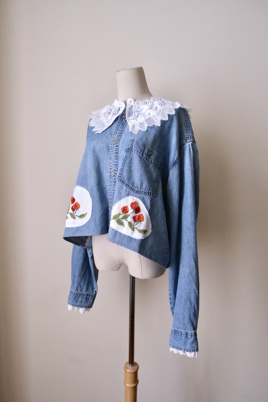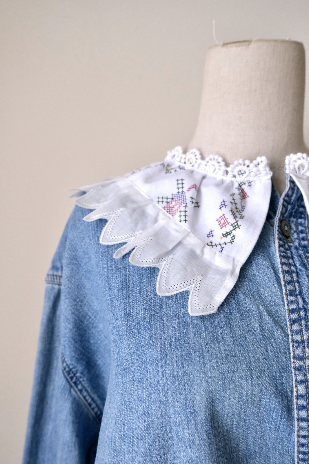 デニムシャツをレース襟や刺繍をパッチワークして可愛くリメイクしています。