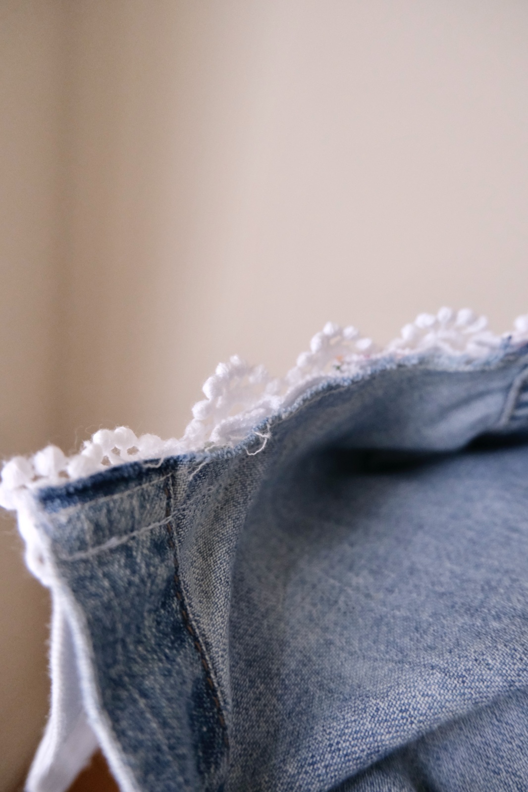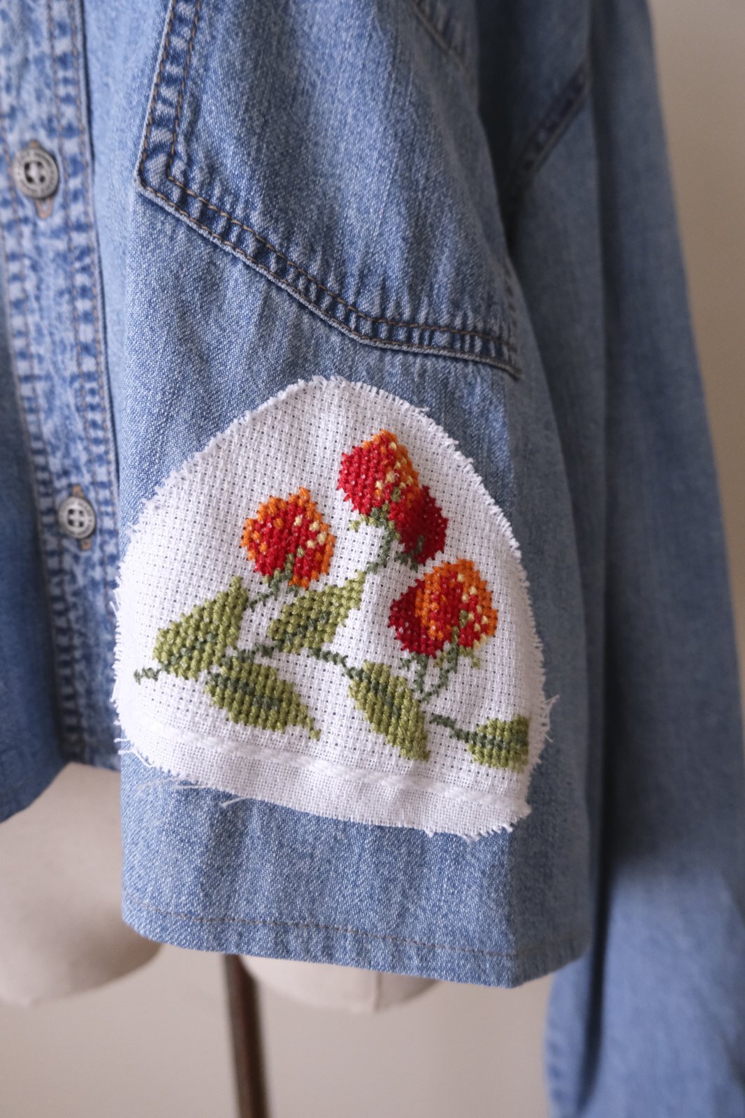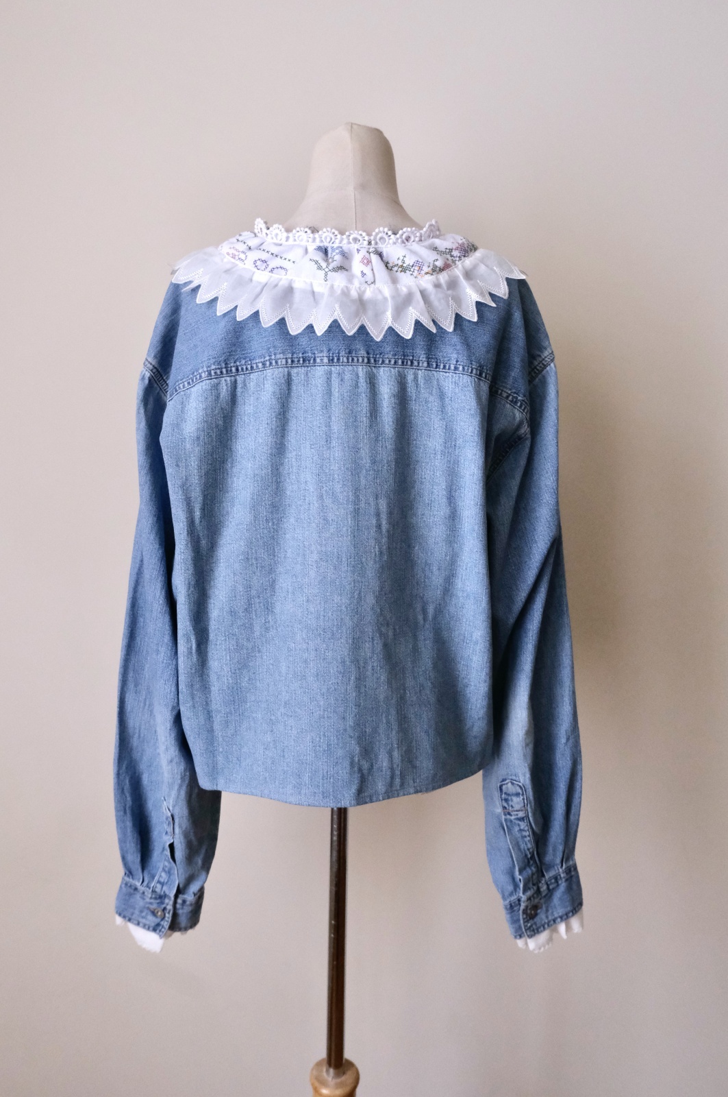 デニムシャツをレース襟や刺繍をパッチワークして可愛くリメイクしています。